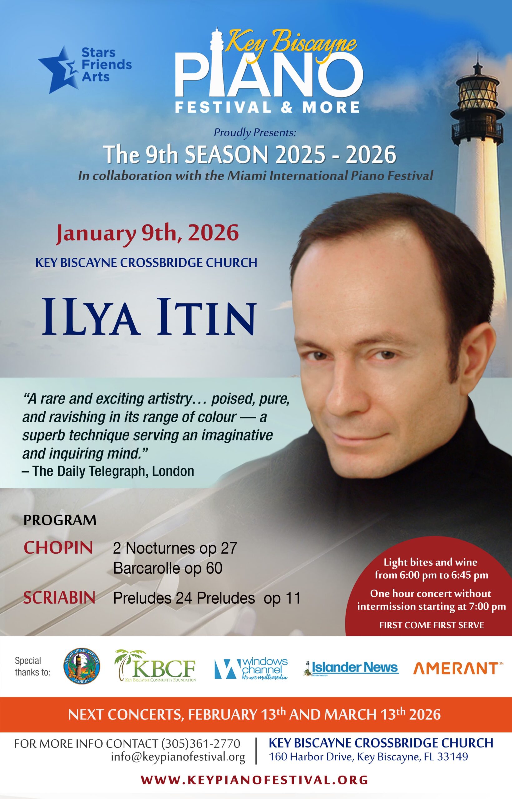 Este concierto representa un hito importante en nuestra temporada: es el segundo concierto de la 9.ª Temporada y el primer recital dedicado íntegramente al piano solista, con la participación del extraordinario pianista Ilya Itin, presentado en colaboración con el Miami International Piano Festival.